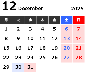 12/30(火) 短縮営業8:30-12:00 (年内最終営業日)