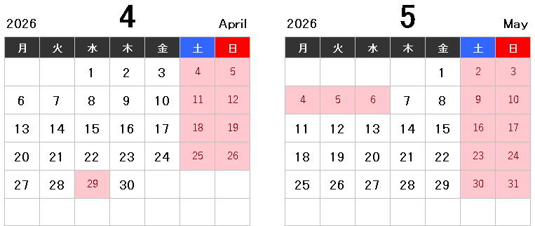 本年のゴールデンウィーク中の営業日、休業日を下記の通りとさせていただきます。